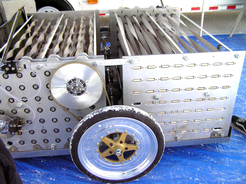 Все-таки, американские товарищи немного crazy. Нет, серьезно: мало им обычных гонок, так они еще придумали совершенно дикие заезды на четверть и половину мили, в которых соревнуются одноразовые монстры с какими-то чудовищными характеристиками. Мало того, что среди них есть и газотурбинные и даже реактивные. Но им все мало, мало и мало, - ну и вот, докатились: на гоночные трассы вышла машина с резиномотором. Точнее, с целой кучей резиномоторов.