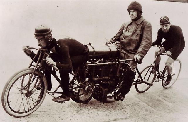 Jun. 5th, 2015 01:01 amНа самом деле, чтобы конструкция выморозила меня своей необъяснимостью, - бывает очень нечасто. Но бывает, как вот этот вот мотоцикл-лидер. Велогонки, в которых перед велосипедистом мчался мотоцикл, раздвигая воздух и упрощая задачу велосипедисту в первой половине прошлого века были весьма популярны. Обтекатели перед гонщиками, - ну, тоже ничего особенного. Но вот зачем мотоциклу два члена экипажа во-первых, да еще с велосипедными педалями под ногами, - я не знаю, и даже не могу придумать. Выручайте.