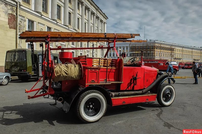 А вот что это такое, по-вашему? С одной стороны, АМО-Ф15 со спецсигналами однозначно указывает на то, что перед нами пожарная машина. Но что за конструкция у нее сзади? В указанное время паровые насосы уже вытеснились насосами с непосредственным приводом от двигателя пожарной машины, и у которых нет ничего похожего на котел паровой машины. И тут подсказкой может служить вторая фотография, как мне кажется.