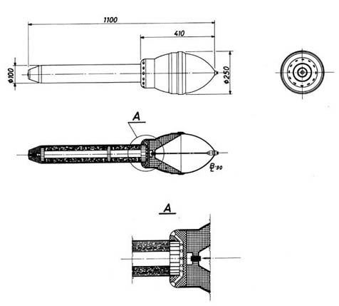 Идея та же самая - две противотанковых ракеты, и наводчик сбоку, отделенный от ракет специальным щитком. Но вот реализация идеи - откровенно хороша. Во-первых, ракеты кумулятивные. Их боевые части весом ВВ 4.212кг и диаметром 215мм пробивали до 300мм бронирования, чего с лихвой хватало на любой танк. И даже попасть в танк было более чем реально - двигатель диаметром 100-мм заканчивался соплом с наклонными каналами, истекающие через которые газы закручивали снаряд так, что он хоть и летел небыстро, со скоростью около 200м/с, - но на расстоянии от 300 до 1200 метров (только для особо крутых) - поражение танка если не с первого, так со второго выстрела выглядело вполне реальным делом (формально стрелять получалось на 2000м - но попадать уже никак).